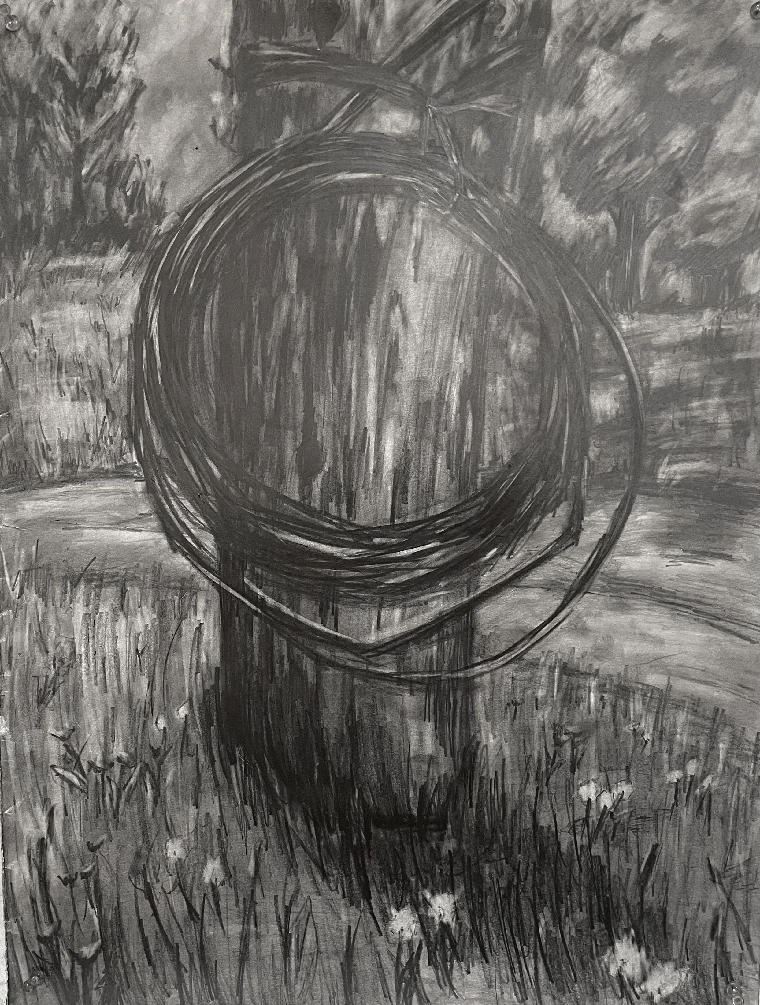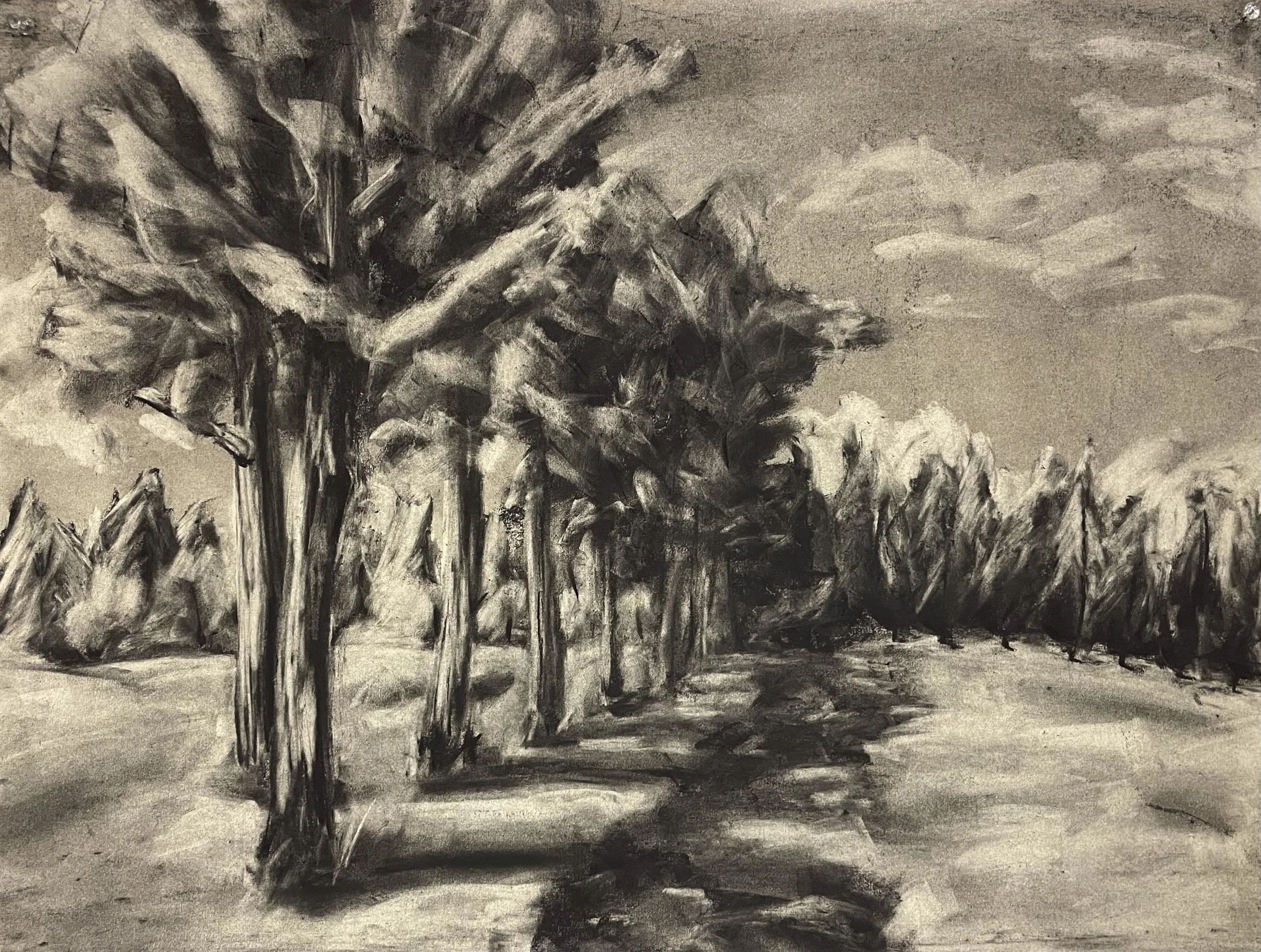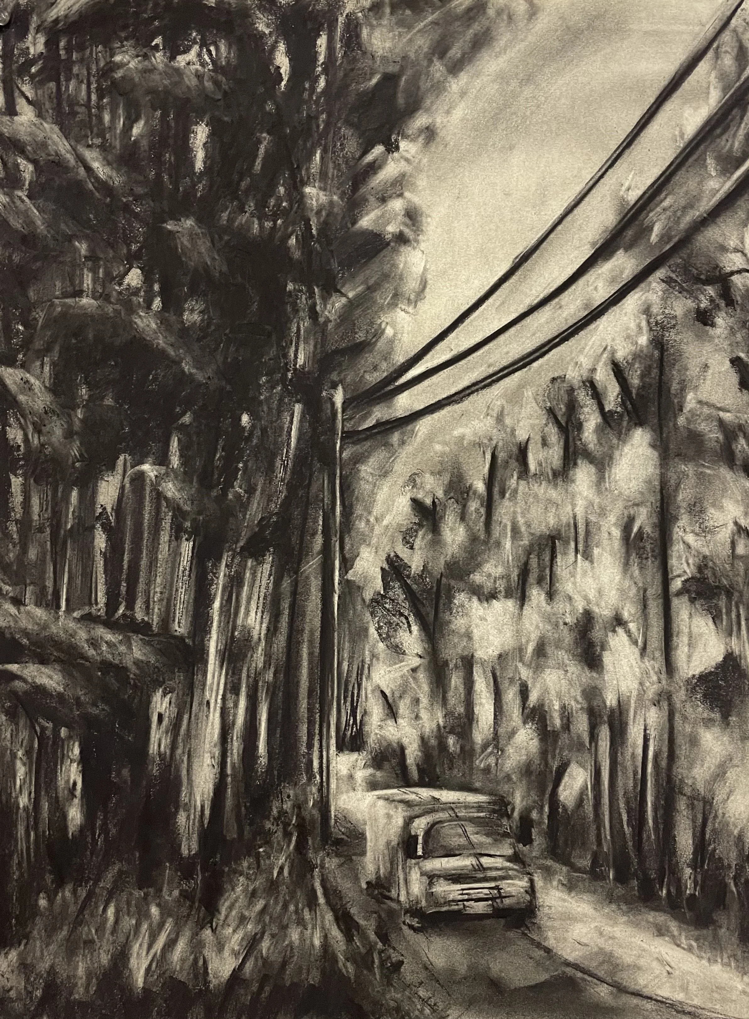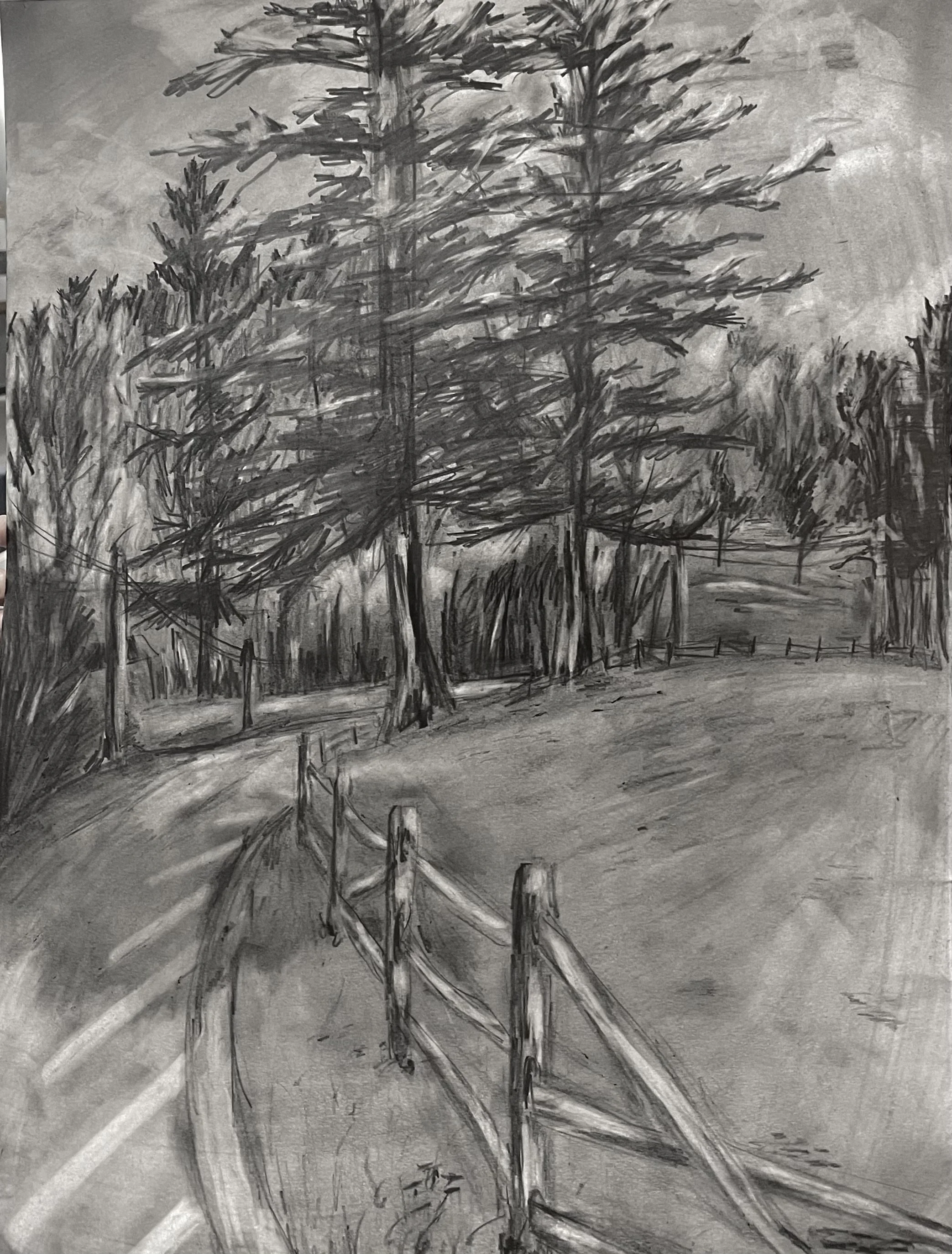 In my work, I have found myself strongly drawn to nature. With drawing and painting, I find myself exploring trees, both concretely and abstractly. My fascination with trees comes from me wanting to capture the gesture of a tree, drawing the feeling of a tree without spending the countless hours needed to render every single branch. My work here spans from detail work in pencil to more gestural impressionist work in charcoal. The main focus of my work with trees is on adding depth to branches and leaves/needles by using highlights, shadow, and scale.