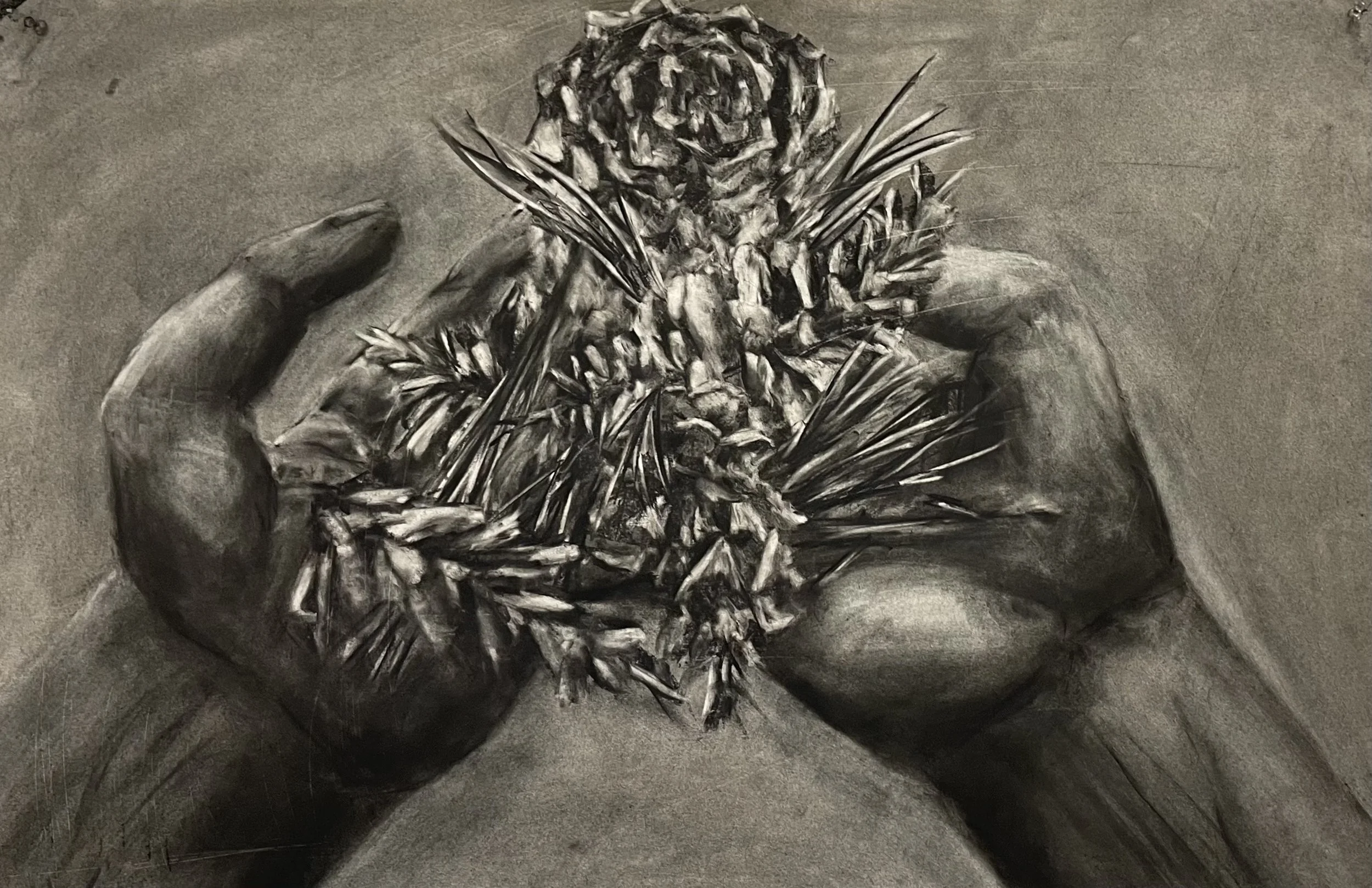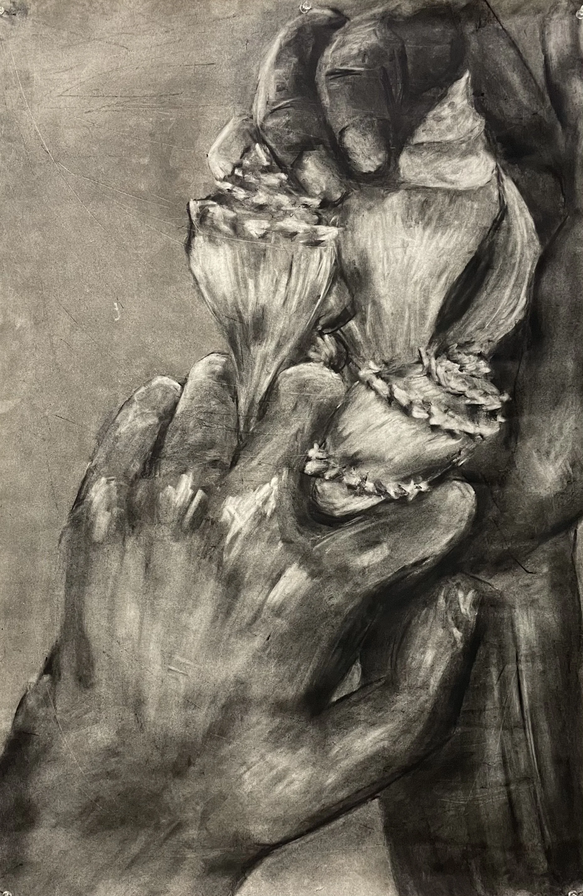 As any artist will tell you, hands are notoriously challenging to draw. Instead of avoiding them, I chose to create a portfolio studying them. The added challenge with these pieces is that I used my own hand for reference. I am a messy artist, and I like using both hands while I work, so this was definitely an adjustment. To investigate different forms, I held different natural objects, tying this work in with much of my other work. These drawings are made in a similar way to the previous work with charcoal wash and an eraser for bright whites.
