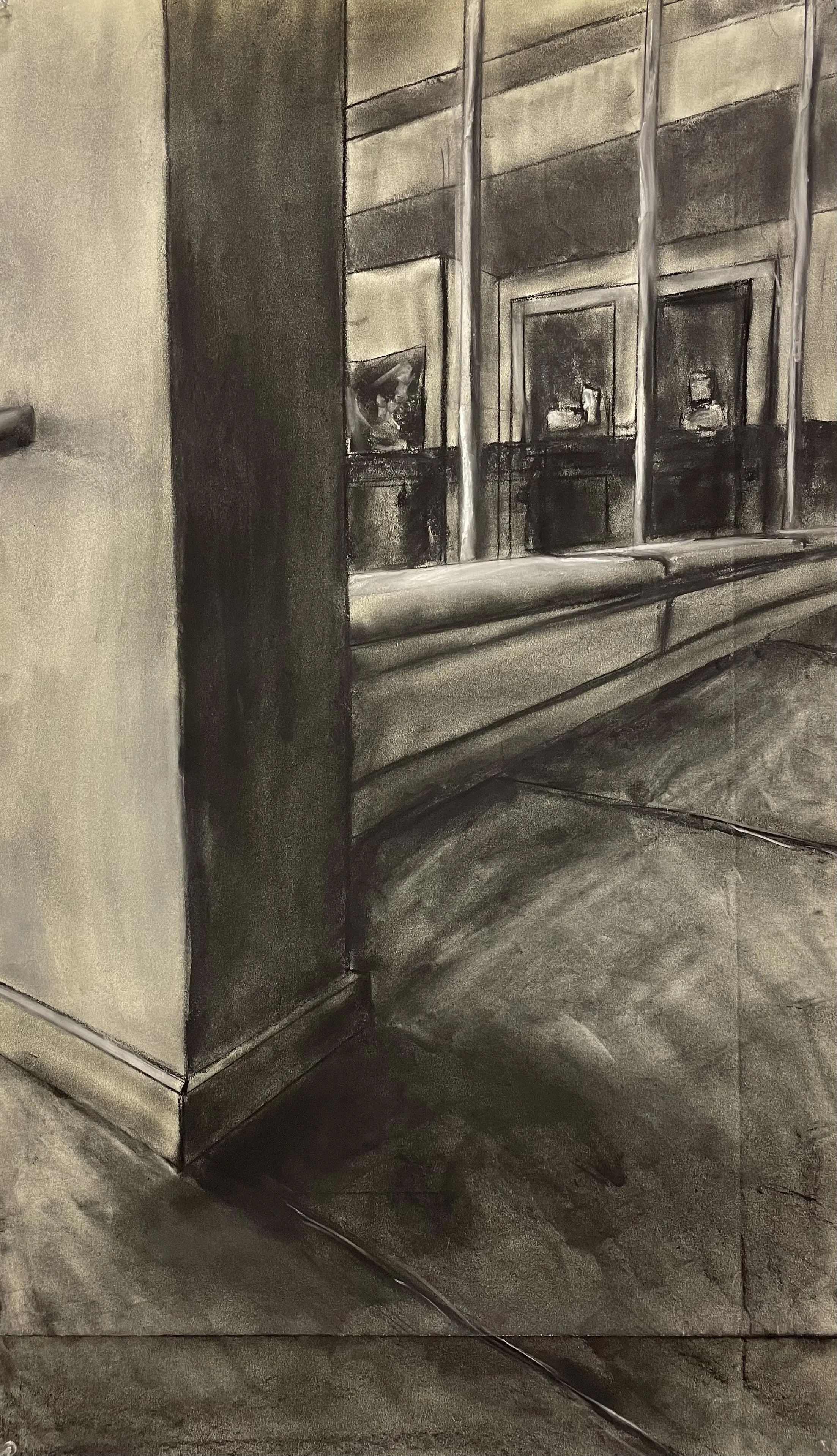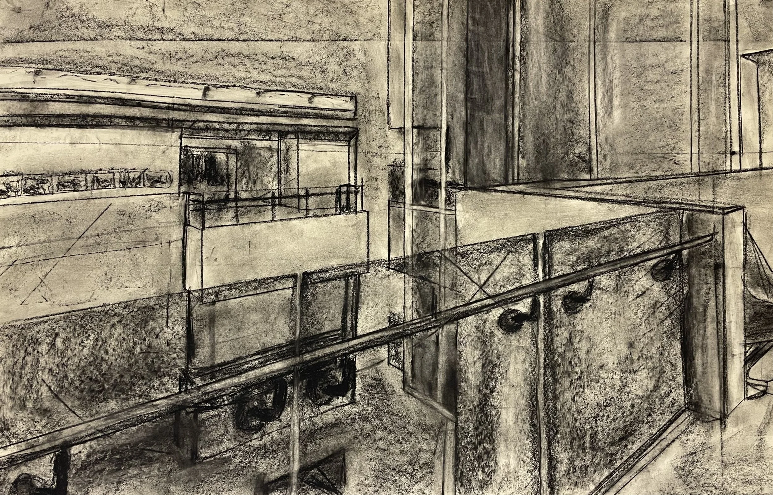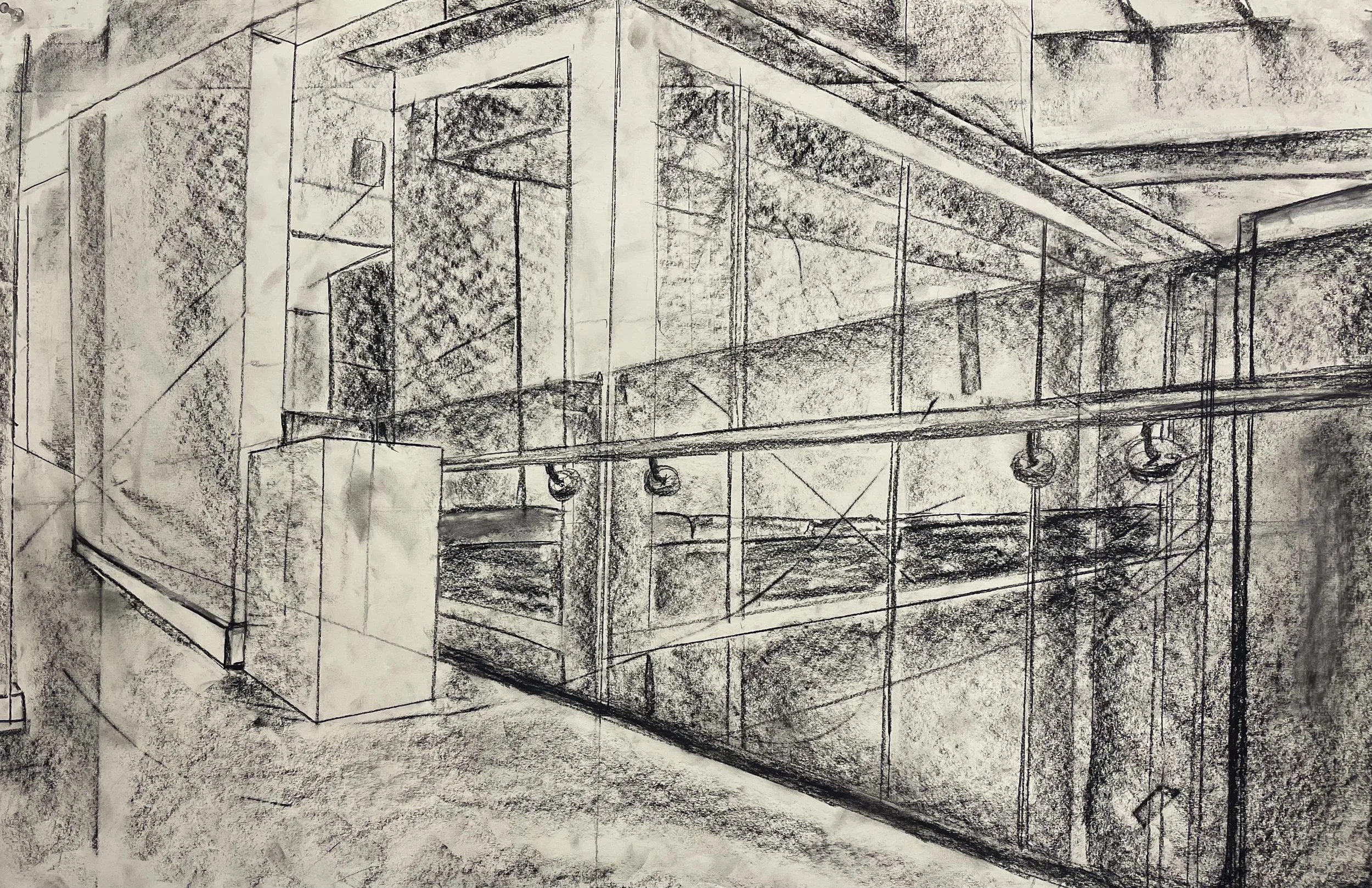 These perspective drawings are light-hearted works capturing the built environment around me. A departure from detailed technique, these pieces focus on line direction, working to lead the viewer deeper into the piece through a collection of long converging lines and planes. These were made from charcoal and white chalk pastel with proportions and use of negative space to illustrate the eye level of the viewer.