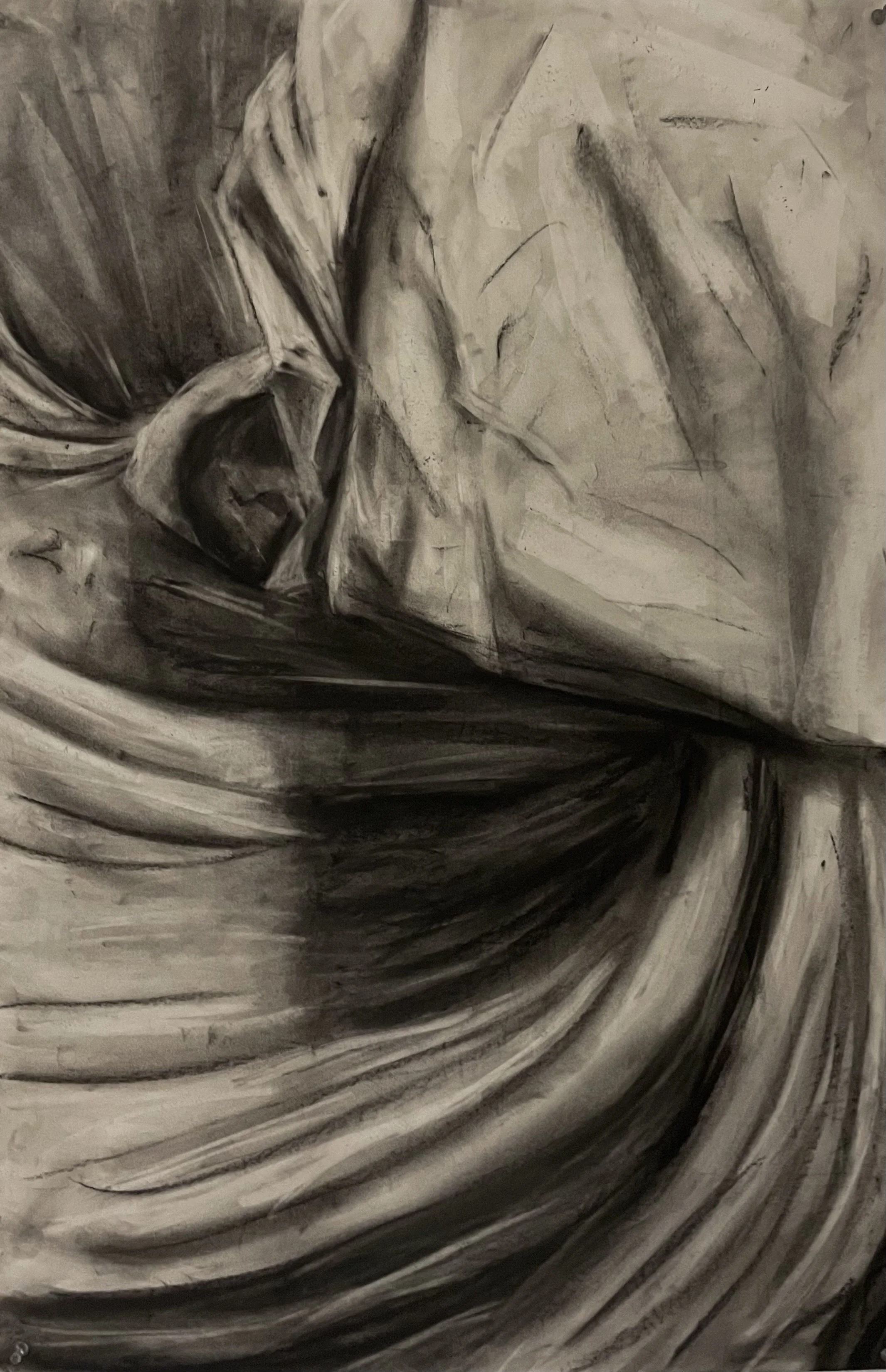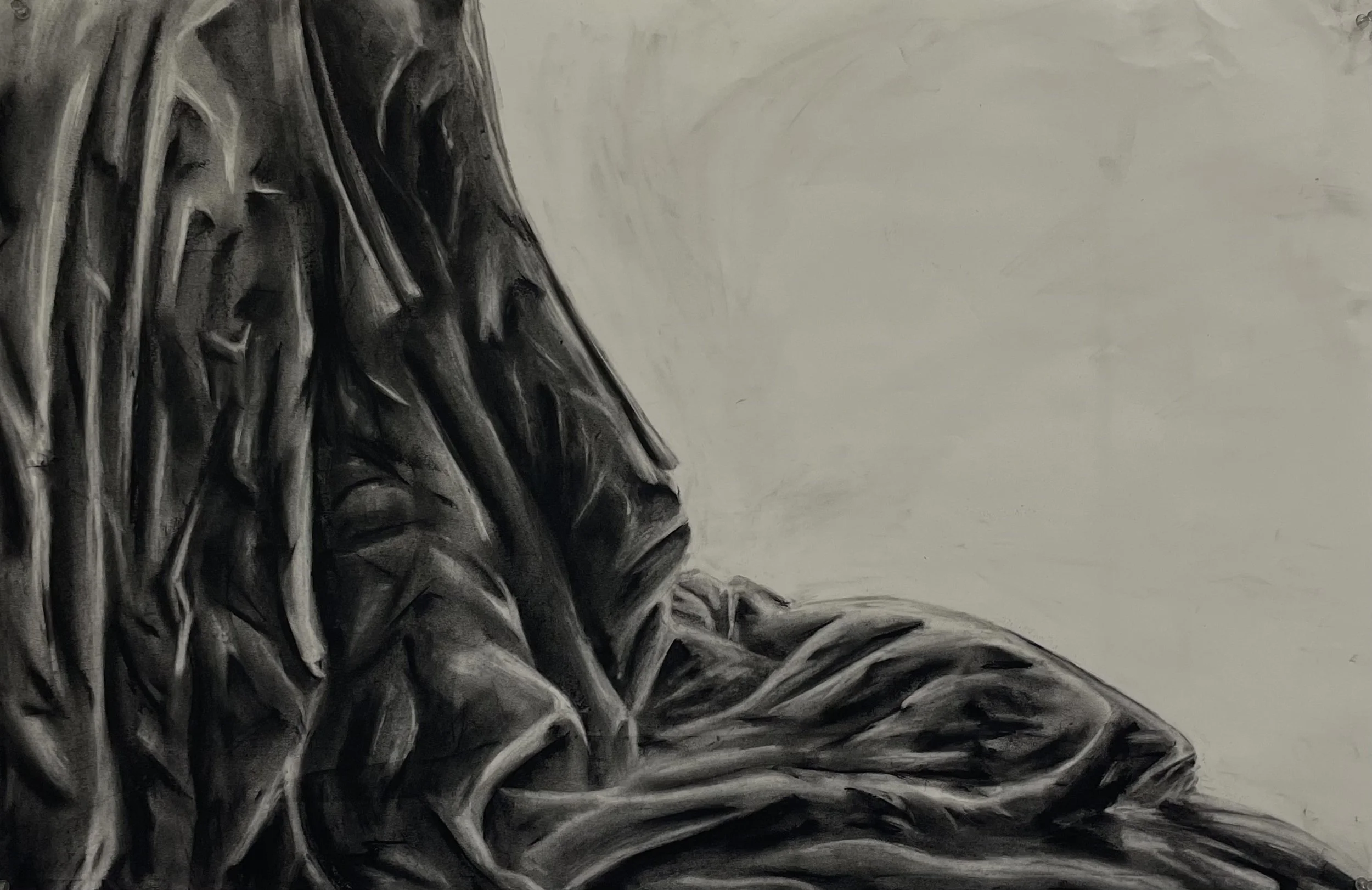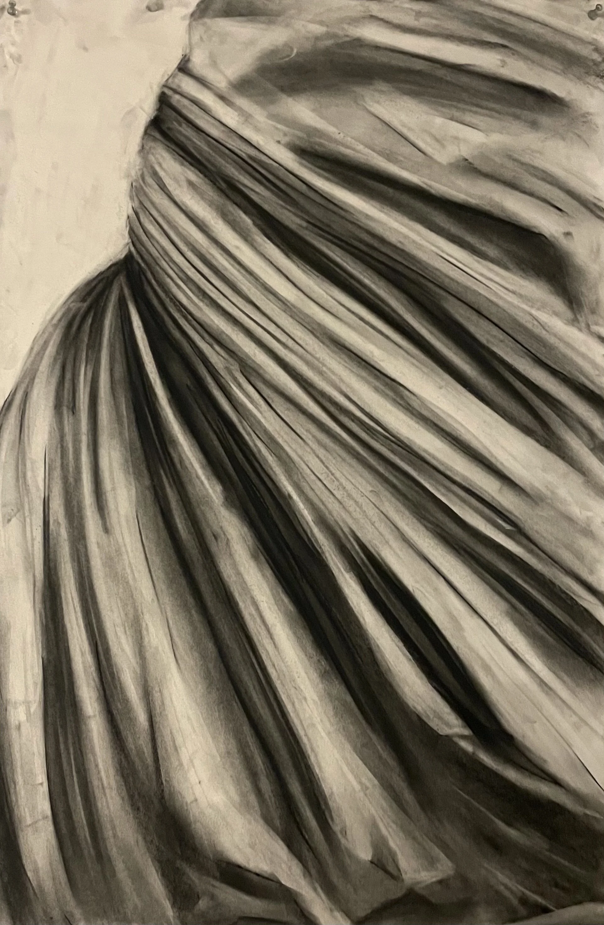 These pieces explore layering up values to create texture. Much of my work focuses on texture rendered through value and material, but to capture the unique types of cloth shown, texture had to be developed with more detail and intention. These pieces are made with charcoal and display thick, thin, and fuzzy fabric in a studio setting.