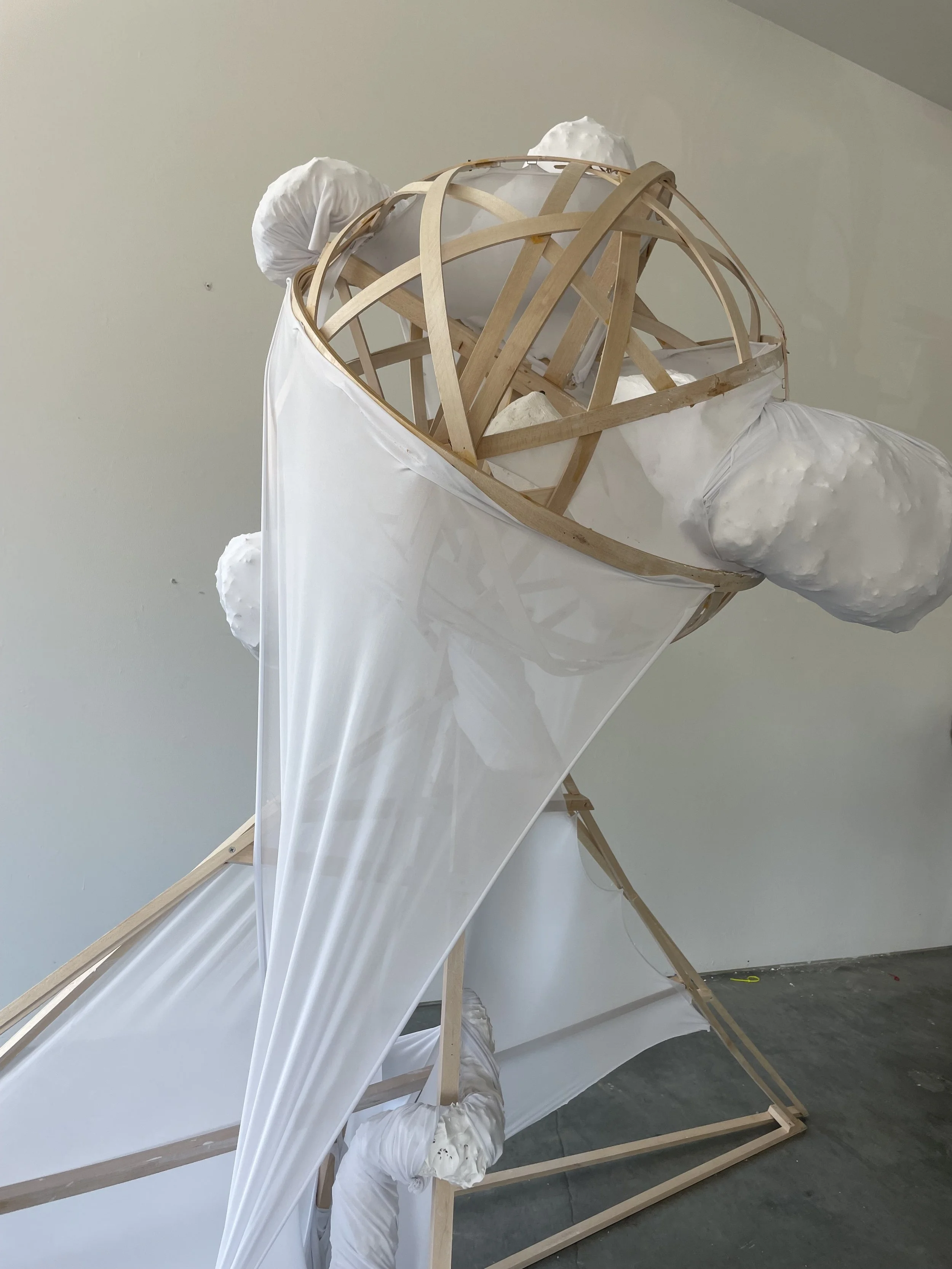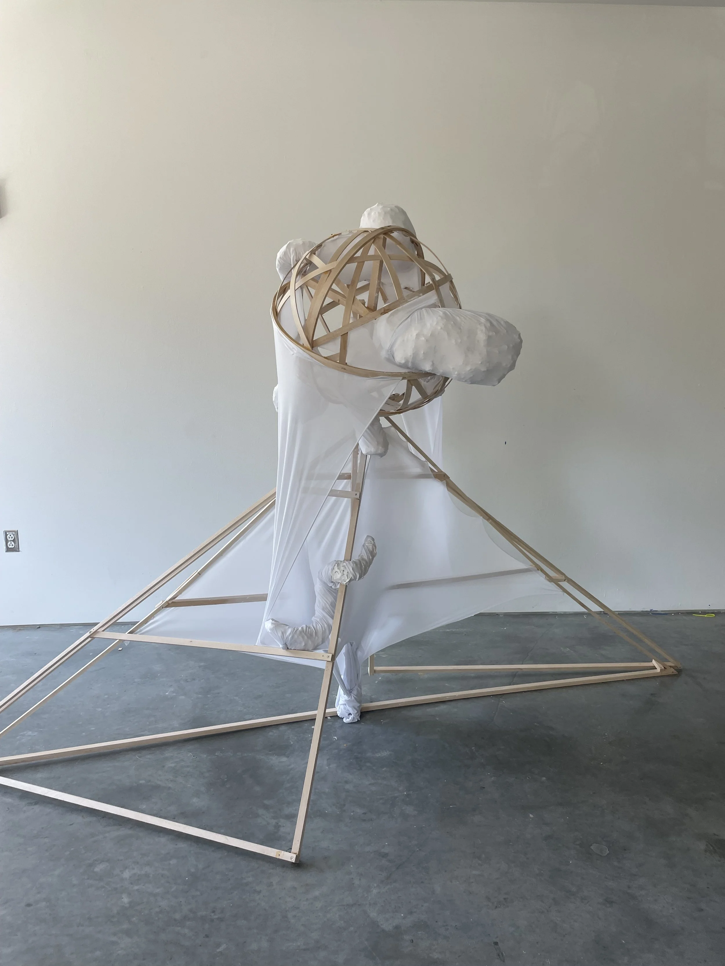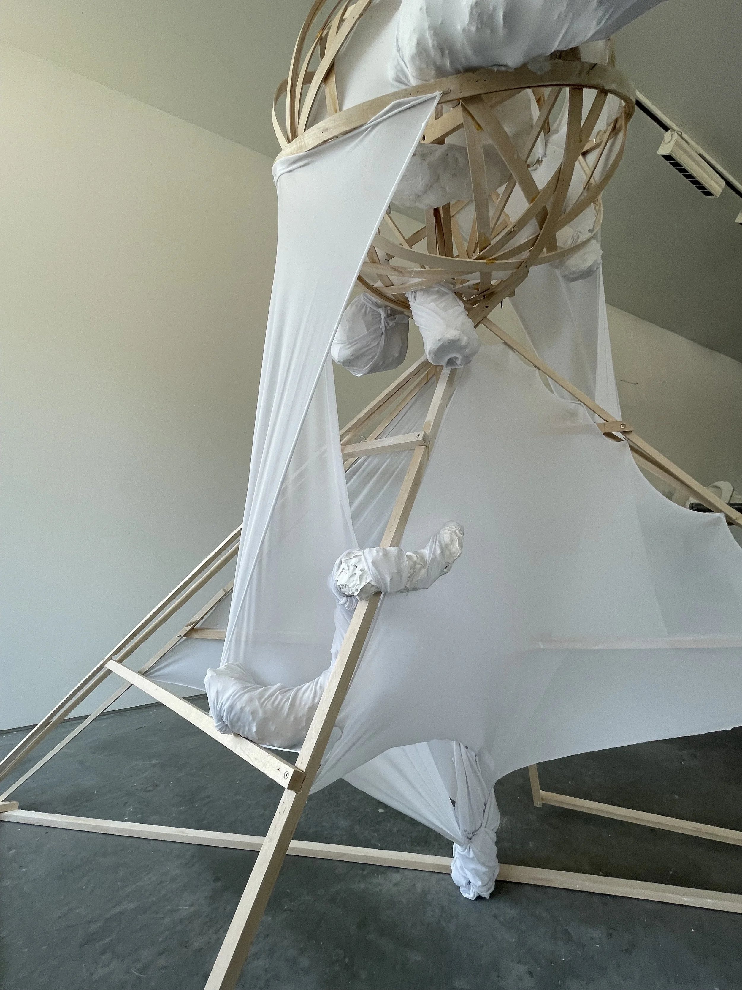 Free-form molded plaster, stretched white silk, warped balsa wood, nails. This piece came together from material exploration, focusing on the rigidity of the wood with the thin stretch of fabric. Both are also contrasted by the heavy yet organic forms of plaster. The construction process heavily informed the final product, with relationships between the wood framing, the stretched silk, and the plaster tentacles in relation to each other to accentuate their texture and material characteristics, inviting the viewer to run their hands across the silk and feel the bumps of the plaster.