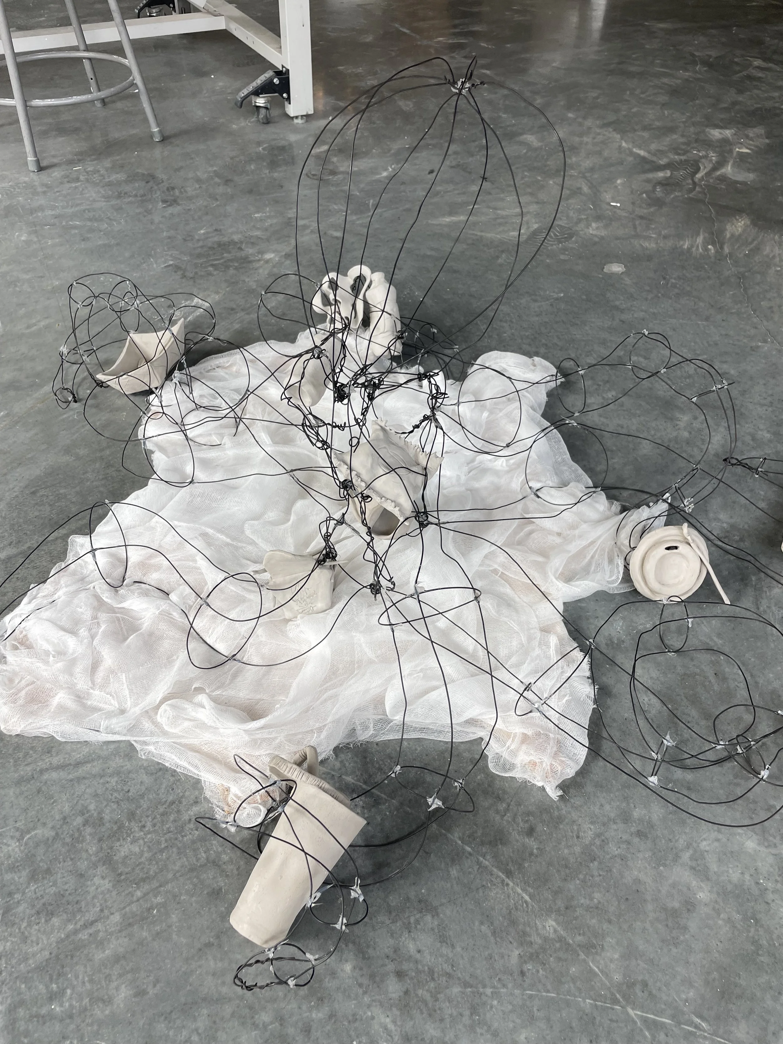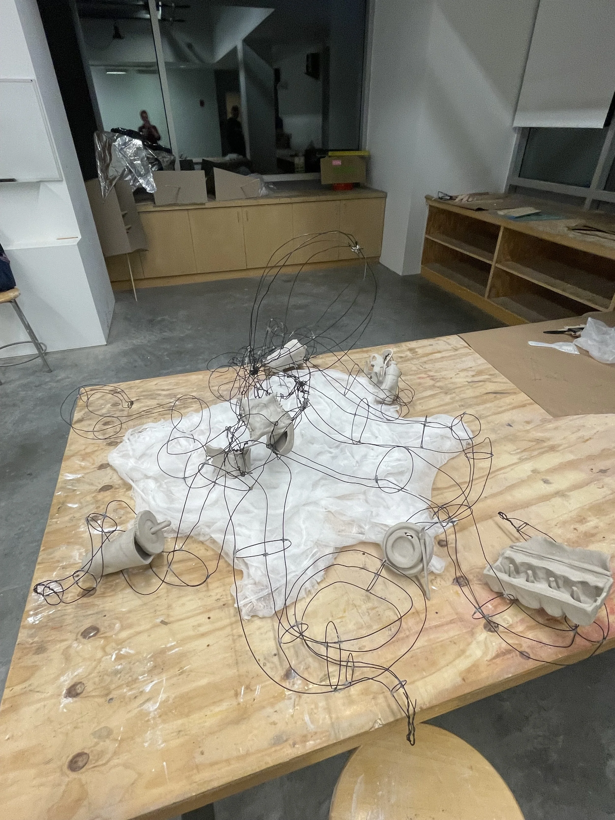 Hand-built air-dry clay, black figure wire, white tule, hot glue. This is a more light-hearted piece working on capturing a more concrete form (contrasting my abstract forms above). A wire octopus wraps itself around its ‘treasures’, common trash made from clay. The irony in this piece is the careful, methodical construction of garbage to be an art object. The hollow octopus draws focus away from the physical form and instead focuses the viewer on the almost-suspended garbage.