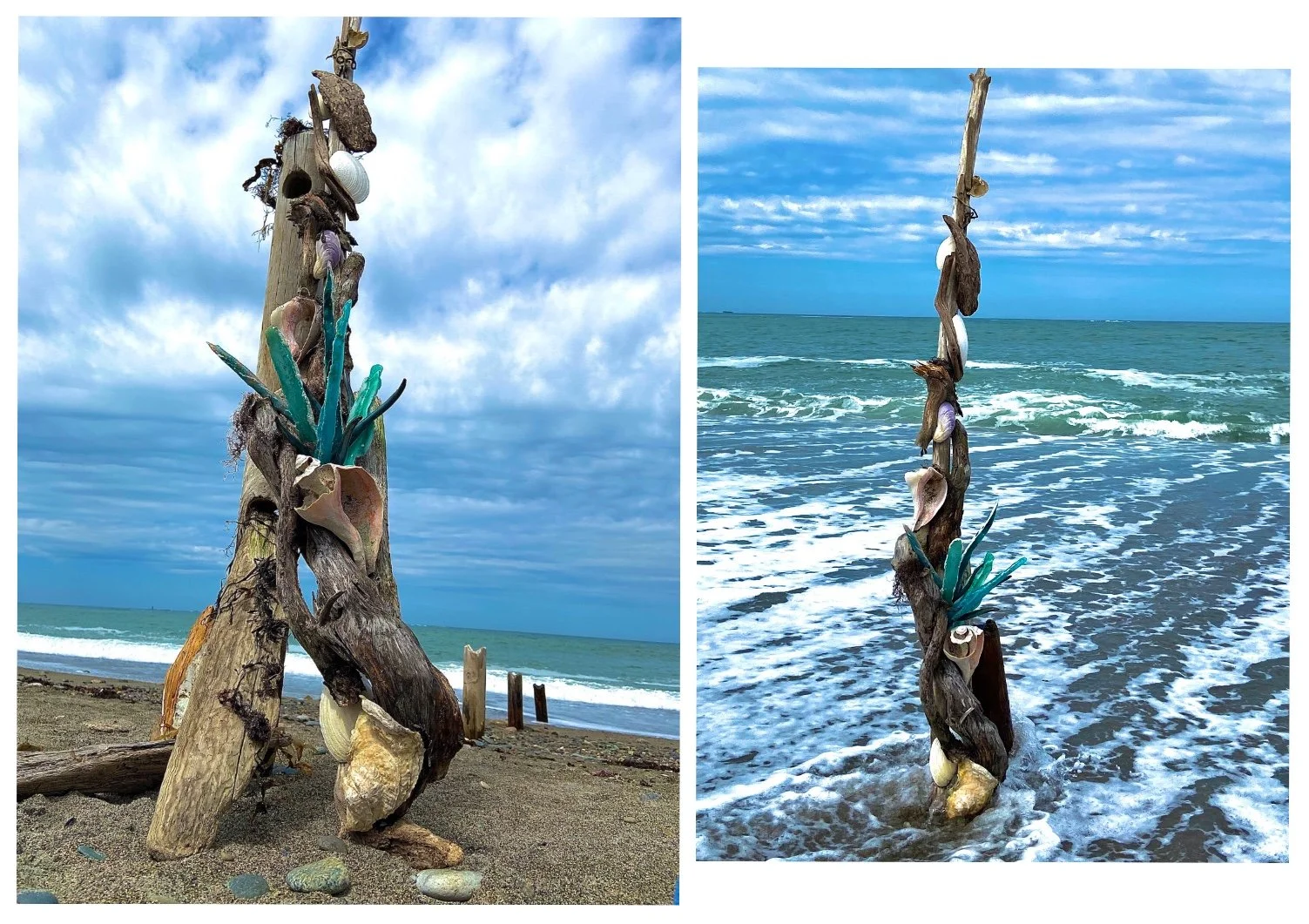 Driftwood, seashells, and cast blue resin. This piece was made from ‘found materials’ and creates a structured natural form that complements the artificial acrylic growth sprouting from the side of the piece. This is shot where this piece would live, washed up and tangled in sea weed and shells.